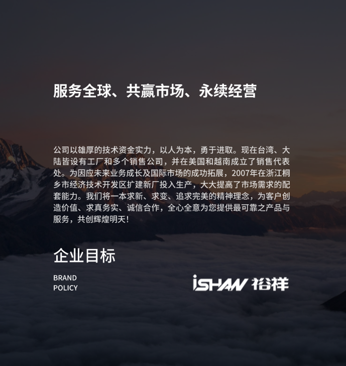 公司以雄厚的技術(shù)資金實(shí)力,以人為本,勇于進(jìn)取?,F(xiàn)在臺(tái)灣、大陸皆設(shè)有工廠(chǎng)和多個(gè)銷(xiāo)售公司,并在美國(guó)和越南成立了銷(xiāo)售代表處。為因應(yīng)未來(lái)業(yè)務(wù)成長(zhǎng)及國(guó)際市場(chǎng)的成功拓展,2007年在浙江桐鄉(xiāng)市經(jīng)濟(jì)技術(shù)開(kāi)發(fā)區(qū)擴(kuò)建新廠(chǎng)投入生產(chǎn),大大提高了市場(chǎng)需求的配套能力。我們將一本求新、求變、追求完美的精神理念,為客戶(hù)創(chuàng)造價(jià)值、求真務(wù)實(shí)、誠(chéng)信合作,全心全意為您提供最可靠之產(chǎn)品與服務(wù),共創(chuàng)輝煌明天!
