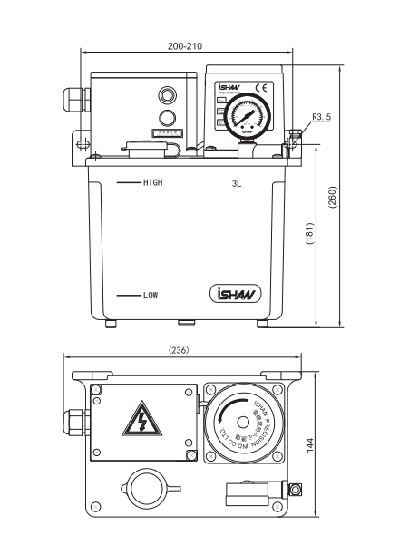 | 單相電壓 (VAC) | 功率 (W) | 異常輸出接點(diǎn)容量 (A) | 潤(rùn)滑時(shí)間 | 間歇時(shí)間 | 吐出口徑 | 最大吐出壓 (kgf/cm2) | 吐出量 (cc/min) | 壓力開(kāi)關(guān) (kgf/cm2) | 液位開(kāi)關(guān) | 油箱容量 (L) | 重量 (kg) | ||||||